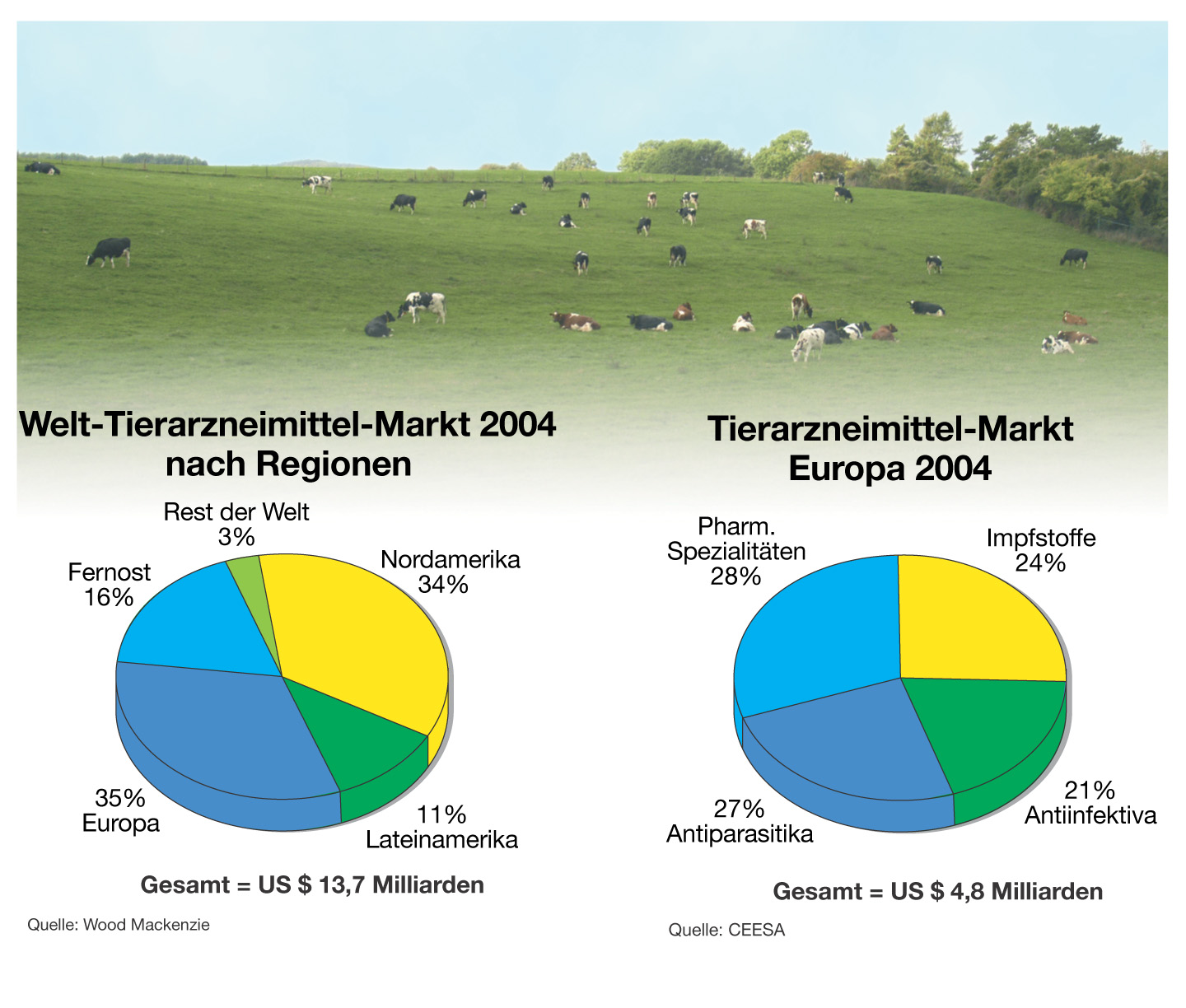 Europa ist einer der wichtigsten Märkte für Tierarzneimittel und Impfstoffe. Im Jahr 2004 wurden mit 4,8 Milliarden US $ rund 35 Prozent der Weltumsätze in Europa getätigt. Einen besonders hohen Stellenwert nimmt die Entwicklung neuer Wirkstoffe und Formulierungen ein, auch wenn dies mit erheblichen Investitionen für die Tiergesundheitsindustrie verbunden ist.