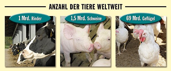 Weltweit stehen eine Milliarde Rinder, 1,5 Milliarden Schweine und knapp 69 Milliarden Stück Geflügel in den Ställen und auf den Weiden der Bauern.