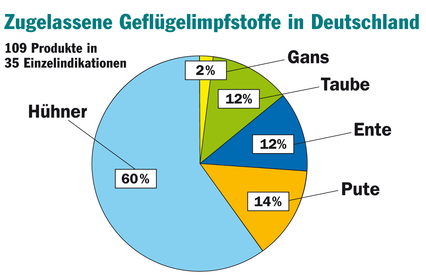 Dabei sprechen die Marktzahlen eine andere Sprache. So hat sich das Segment der Geflügelimpfstoffe in den vergangenen Jahren gut entwickelt. Präventionsmaßnahmen mit modernen, an die aktuelle Situation angepassten Impfstoffen nehmen einen hohen Stellenwert in den Produktionssystemen ein. Spezielle Zulassungen nach Tierarten und Nutzungsrichtungen werden ständig erweitert, die Verfügbarkeit der Produkte immer weiter optimiert. Dies trifft insbesondere auf den Impfstoffbereich zu, der bereits einen sehr hohen Innovationsgrad erreicht hat. In Deutschland sind derzeit 109 Geflügelimpfstoffe in 35 Einzelindikationen zugelassen. Das durchschnittliche Wachstum der Geflügelimpfstoffe in Deutschland betrug in den letzten 6 Jahren 9,4 Prozent pro Jahr.