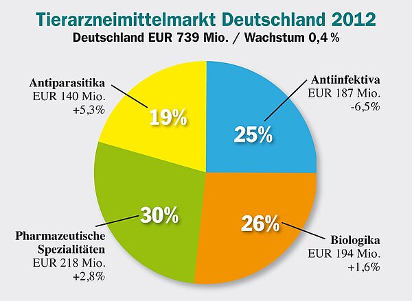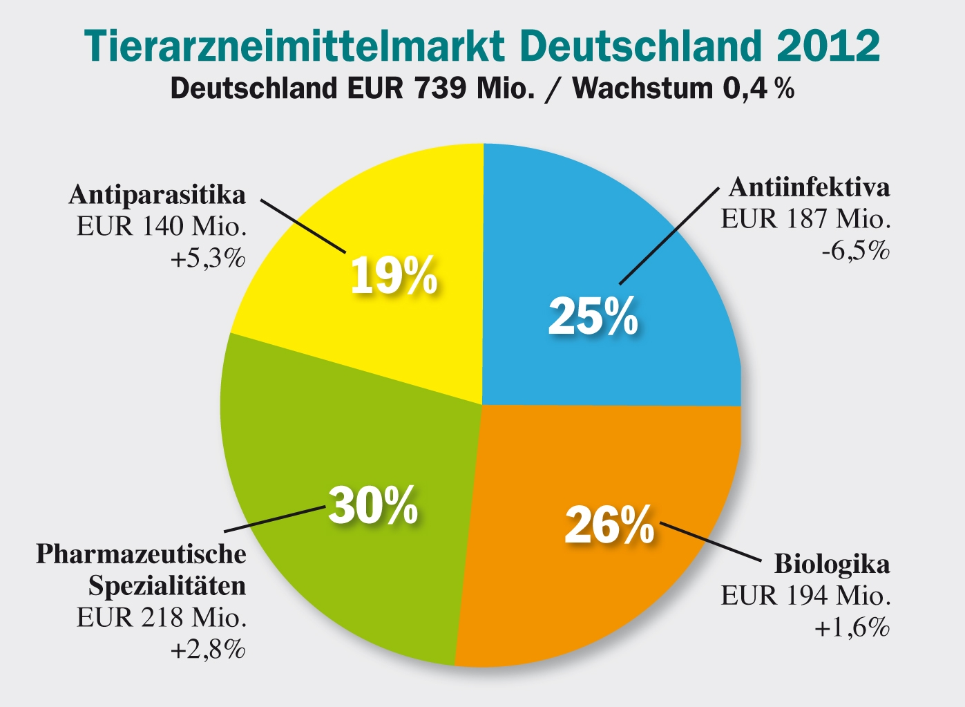 Hauptgrund für die sehr schwache Entwicklung war der deutliche Abfall der Antibiotikaumsätze mit -6,5 Prozent. Der Rückgang erstreckte sich auf Produkte für die orale und die Injektionsbehandlung. Besonders hoch war der Rückgang der Behandlung über das Trinkwasser mit -20 Prozent. Bei den Impfstoffen wuchs im Nutztierbereich nur das Geflügelsegment mit +8,5 Prozent gut. Rinder- und Schweineimpfstoffe konnten insgesamt kaum zulegen. Impfstoffe für Hund und Katze stiegen um rund 3 Prozent.