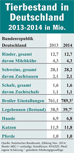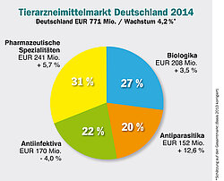 Die Basis für die Abbildung des Tierarzneimittelmarktes in Deutschland bilden Umsätze der Mitgliedsunternehmen des Bundesverbandes für Tiergesundheit (BfT) und eine allgemeine Einschätzung des Gesamtmarktes. Zum Wachstum trugen in 2014 vor allem Impfstoffe, Antiparasitika und die Pharmazeutischen Spezialitäten bei. Das Wachstum bei Impfstoffen für Nutztiere wird vor allem durch die Tierbestandszahlen beeinflusst, die sich insbesondere bei Schweinen und Rindern nur leicht positiv entwickelten. Das Antiinfektiva-Segment ist um 4 Prozent wieder abgesunken.
