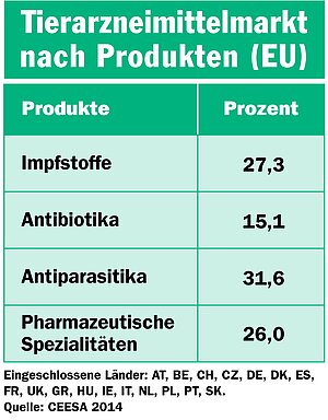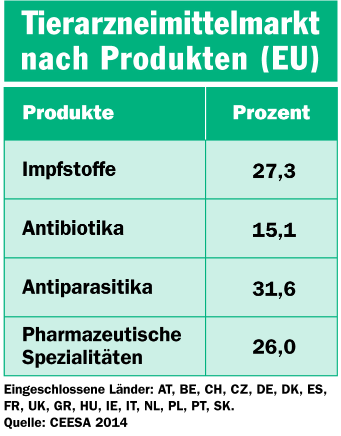 Insgesamt waren das laut CEESA für 2014 über 5 Mrd. Euro. Größter Umsatzträger sind die Antiparasitika mit über 31 Prozent. Nur knapp dahinter liegen die Umsätze für Impfstoffe mit rund 27 Prozent. Antibiotika sind weiter zurückgegangen auf rund 15 Prozent.