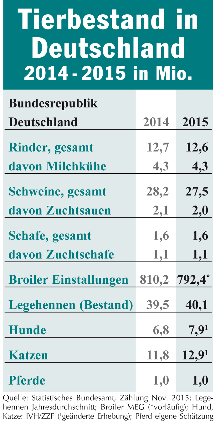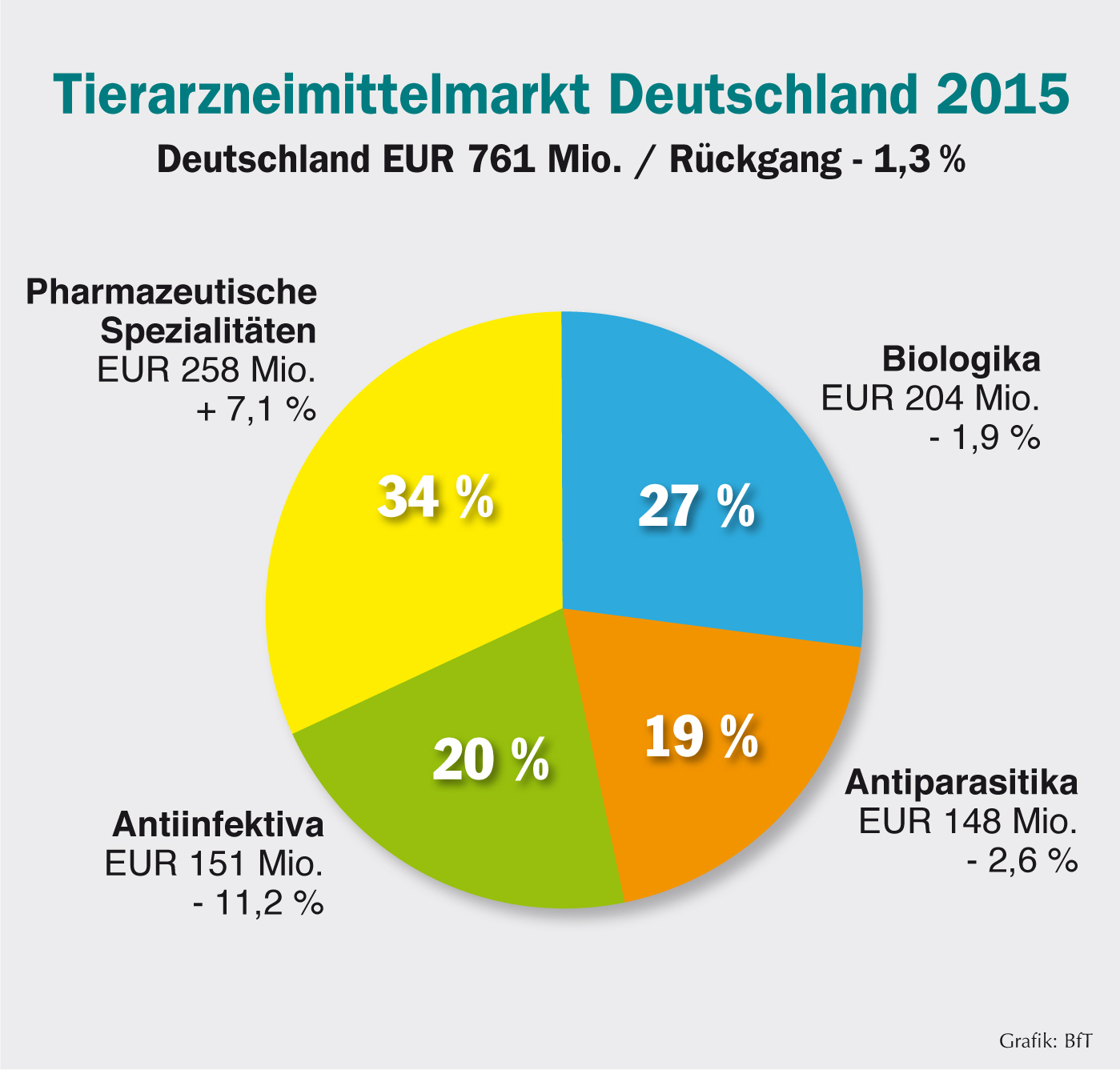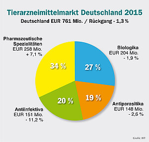 Der Tierarzneimittelmarkt belief sich in 2015 insgesamt auf 761 Mio. Euro. Er war mit minus 1,3 Prozent rückläufig gegenüber dem Vorjahr. Damit hat sich die Dynamik des Marktes in den vergangenen vier Jahren deutlich abgeschwächt.