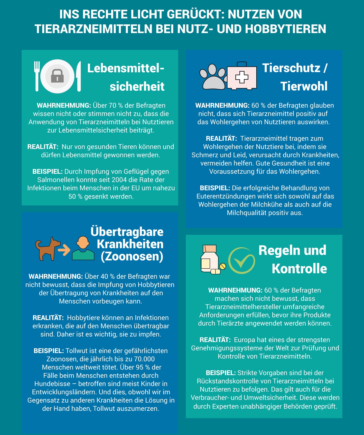 Lücken zu den Fakten und das damit teilweise verbundene Unbehagen sind auf das Fehlen sachgerechter Informationen zurückzuführen. „Die Ergebnisse der Umfrage zeigen, dass wir noch mehr aufklären müssen, darüber wie Tierarzneimittel kontrolliert und verantwortungsvoll eingesetzt werden und welche Vorteile sie für Tiere und Menschen bringen“, interpretiert die Geschäftsführerin des Bundesverbandes für Tiergesundheit, Dr. Sabine Schüller, die Ergebnisse. „Wir müssen durch faktenbasierte Kampagnen verdeutlichen, warum Tierarzneimittel benötigt werden und was gesunde Tiere für die Gesellschaft als Ganzes bedeuten.“