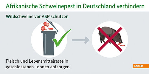 Denn das Virus wird nicht nur direkt über Tierkontakte übertragen. Weitaus größer ist die Gefahr der indirekten Übertragung, zum Beispiel über Fleisch oder Wurst von infizierten Tieren. Unter ungünstigen Bedingungen können unachtsam entsorgte Reste von virushaltigem Reiseproviant ausreichen, um die Seuche einzuschleppen. Solche Essensreste sollten daher vermieden oder aber ordnungsgemäß entsorgt (das heißt: für Wildschweine nicht zugänglich) werden. Zum Themenkomplex der Biosicherheit hat das BMEL eine Reihe von Informationen publiziert, die sich an Jäger, speziell an Teilnehmer von Jagdreisen, Privatreisende, aber auch an ausländische Arbeitskräfte richten.