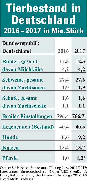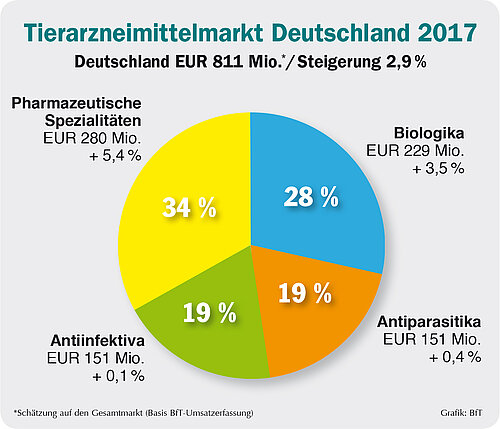 Der Tierarzneimittelmarkt Deutschland belief sich 2017 auf 811 Mio. Euro. Das stärkste Wachstum wurde bei den sogenannten Spezialitäten erzielt. Zu verzeichnen sind diese Zuwächse im Kleintiersegment, und hier vor allem bei Produkten für Hautbehandlungen und bei der Versorgung geriatrischer Patienten. Das Antiinfektivasegment dagegen stagniert weiter, was insbesondere auf die Reduktion der Anwendung von Antibiotika bei Nutztieren zurückzuführen ist. Der Anteil Hobbytier am Gesamtumsatz macht derzeit 53 Prozent aus.