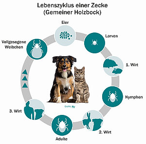 Im Frühjahr ist die Gefahr eines Zeckenbefalls besonders groß. Die kleinen Blutsauger werden mit zunehmenden Temperaturen immer aktiver und lauern im Unterholz, nach einem langen Winter sind sie ausgehungert und machen sich auf die Suche nach ihrer ersten Blutmahlzeit des Jahres. Hunde, Katzen und auch der Mensch sind besonders beliebt. Der eigentliche Zeckenstich hat für die Tiere zwar meist wenig Folgen. Eine sehr viel größere Bedeutung haben Zecken aber als Überträger von gefährlichen, vor allem für den Hund teils lebensbedrohlichen Krankheiten, wie der Borreliose oder der Babesiose. Auch die für den Menschen gefährliche Frühsommer-Meningoenzephalitis (FSME) wird durch von Zecken übertragene Viren ausgelöst. Die Zahl infizierter Zecken in Hochrisikogebieten wird auf etwa ein bis vier Prozent geschätzt. In allen Gegenden, in denen ein Infektionsrisiko für den Menschen besteht, ist auch der Hund gefährdet. Anders als beim Menschen kommt es bei Hunden jedoch nur selten zu einer FSME-Erkrankung.